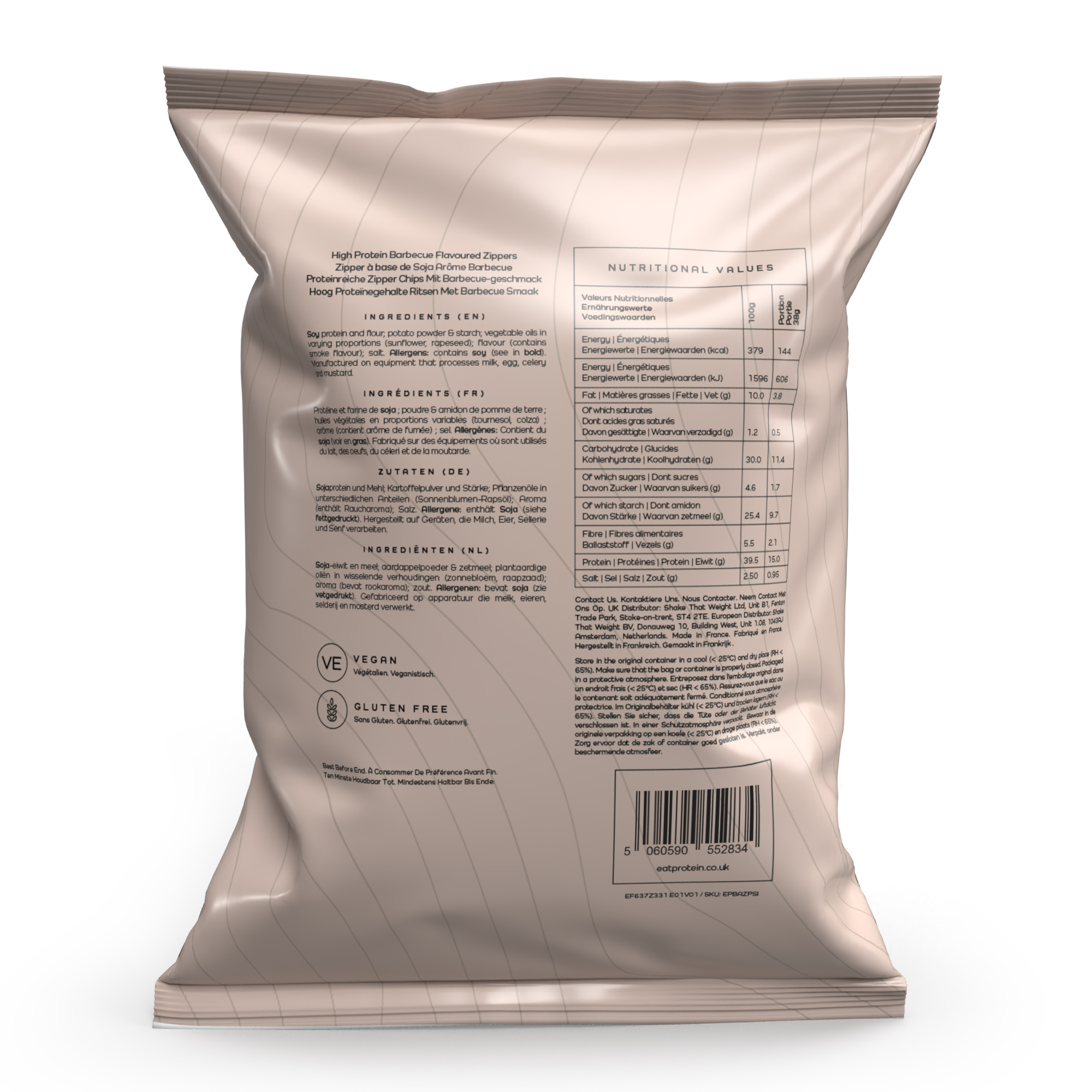 Bold barbecue-flavoured protein zippers with 15g of protein and just 144 calories per serving. Vegan, gluten free and packed with flavour — a satisfying high-protein snack that fits effortlessly into a plant-based lifestyle.