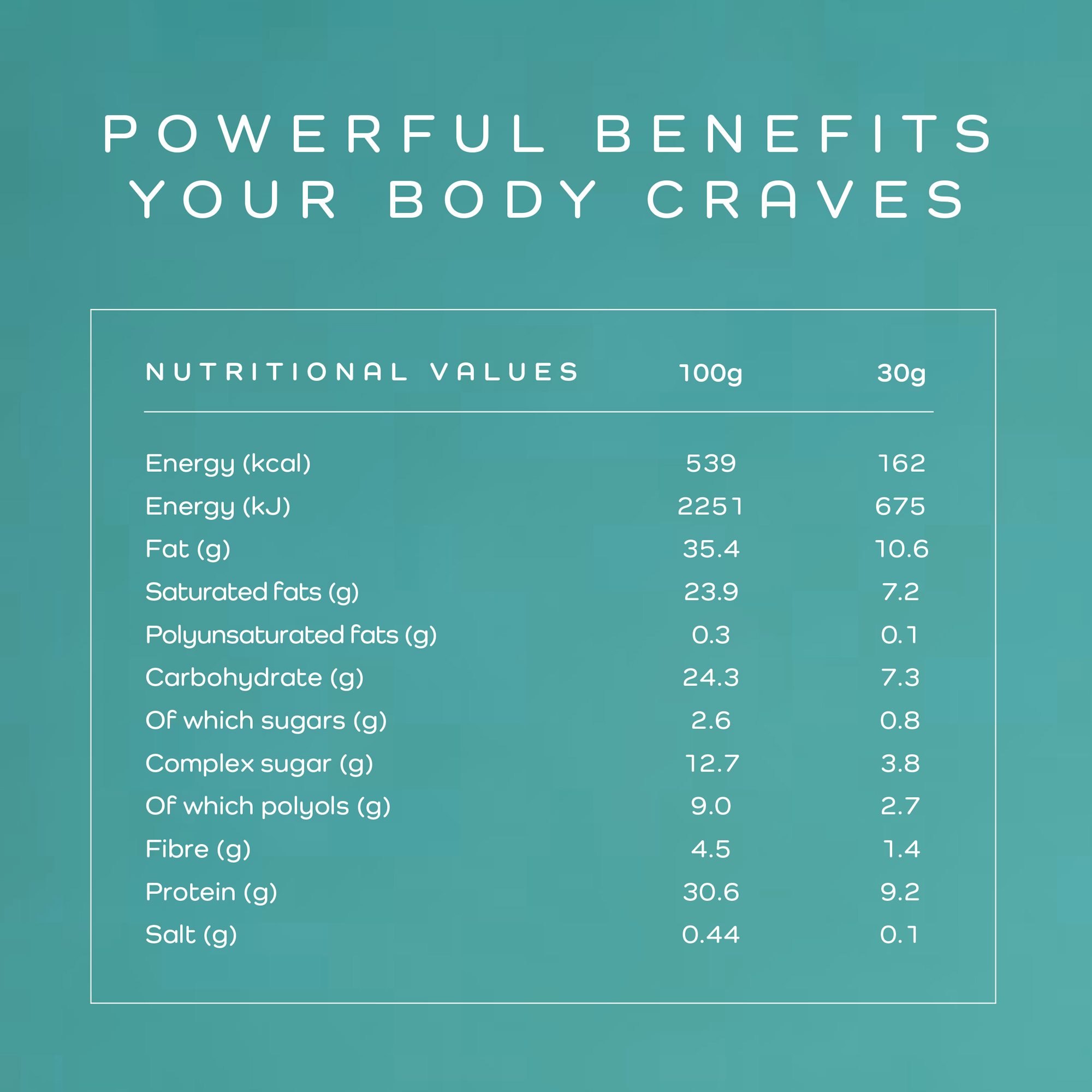 | Nutrient | Per 30g serving | Per 100g |