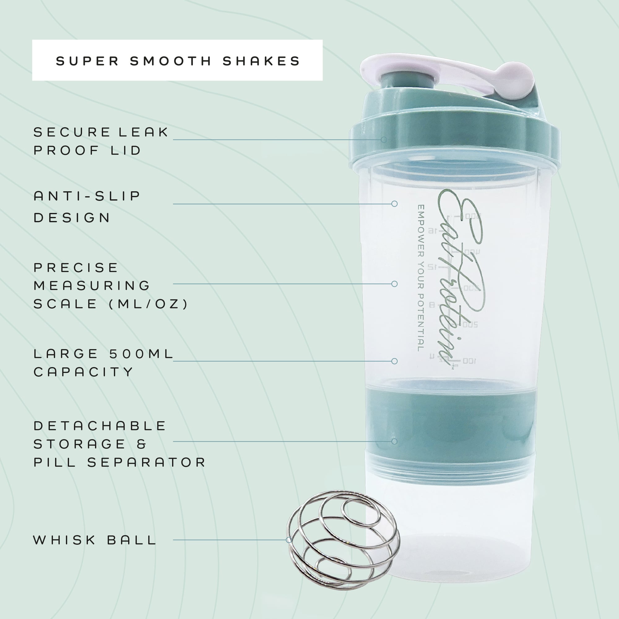 Yes. The wire mixing ball and 500ml capacity work beautifully with any protein powder — plant-based, whey, casein, collagen — as well as pre-workouts, BCAAs, greens powders and meal replacements. It’s designed as the perfect companion for EatProtein products, but it works brilliantly with everything.