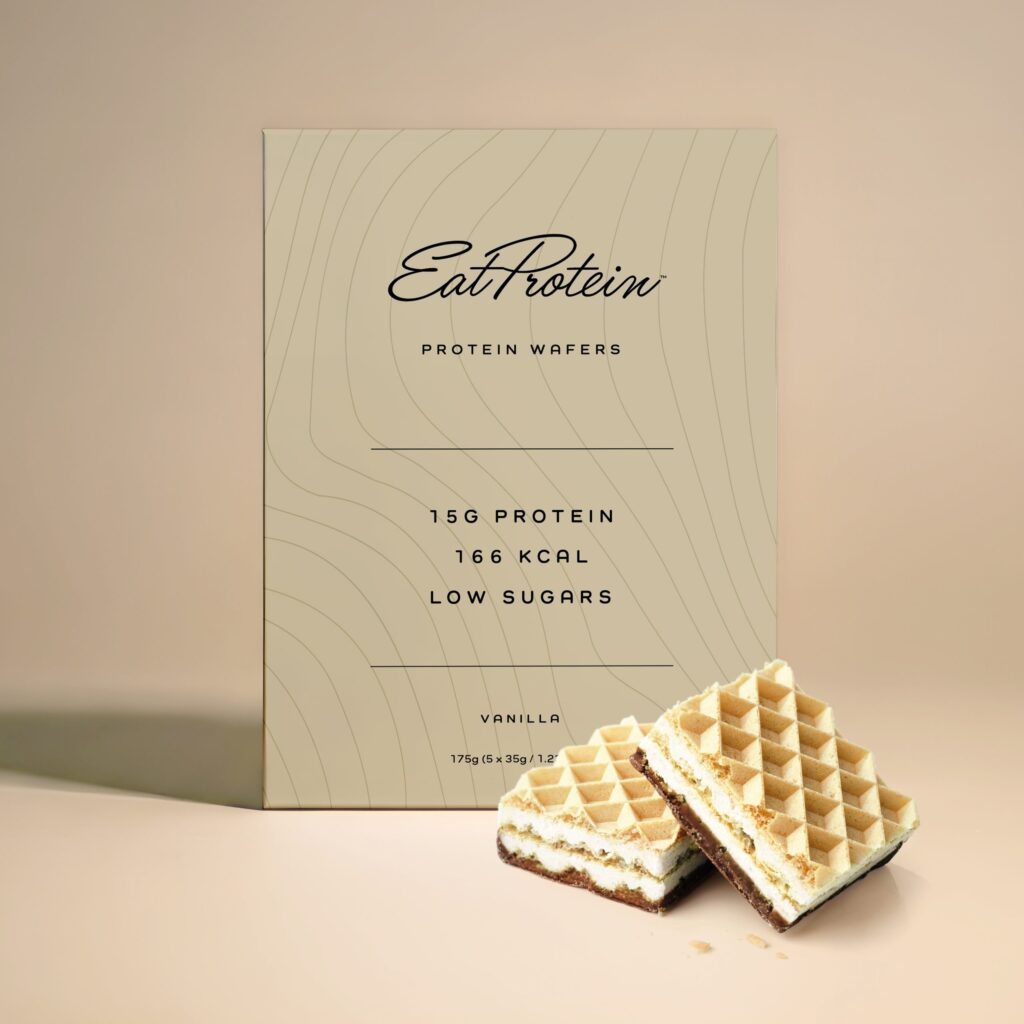 Crispy vanilla wafers layered with collagen and protein — each pack contains 2 wafer fingers delivering 15g of protein, 6,000mg of collagen and just 166 calories. Low in sugar, high in fibre. Box of 5 packs (10 wafers total).